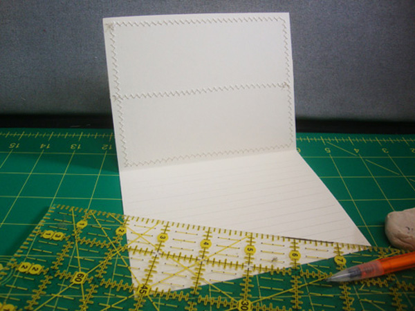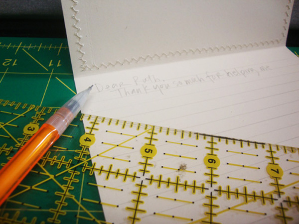 So, before the day is gone, I will get on with my tip. I use a quilting ruler to measure my lines. This is one of my favorite tools. It has lots of lines and a well-marked grid to follow. If I need to write a longer note, I use a 1/4″ space. Starting at the bottom, I line up the ruler with the bottom of the paper and make a light pencil line, 1/4″ up from the bottom. Working my way up, I continue marking the lines, leaving a slightly bigger space at the top. Take care not to get off the mark even slightly or you will find your lines slanting a lot by the time you get to the top.