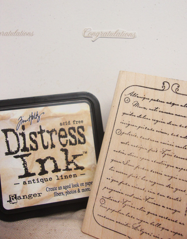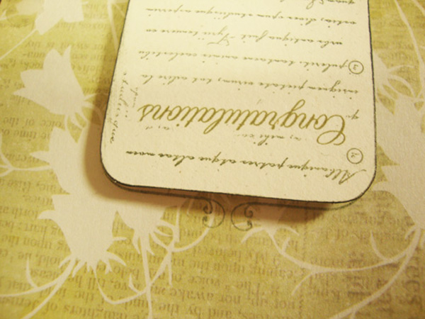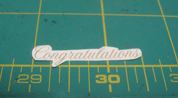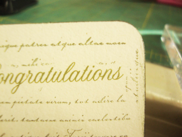 I only used one sheet of patterned paper (12″ X 12″ double-sided), four sheets of 8 1/2″ X 11″ cardstock…3 for the inside text printed and one with several of the “Congratulations” printed on the sheet, spaced so that it would allow me to stamp over the text. I’m a little on the cheap side when it comes to stamps – this comes from experience and a lot of great stamps that I use once or twice and then they get put in a drawer not to be seen for years. I can’t bring myself to buy a bunch of word stamps, especially if I think that I can come up with an acceptable font or an easy saying and I can print them on my computer. Besides, with a computer font, you can resize the text according to your design needs.