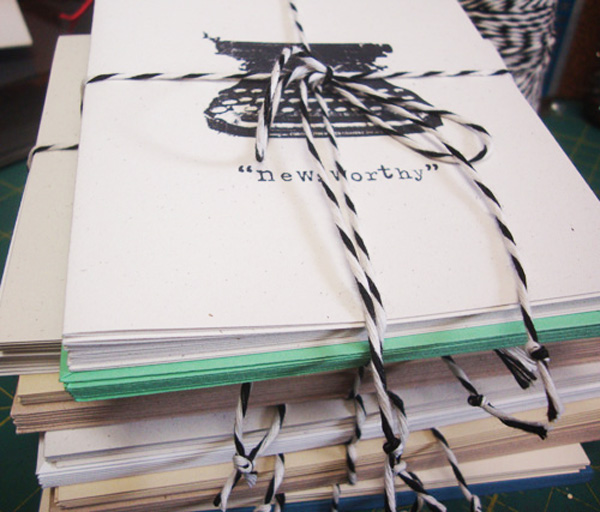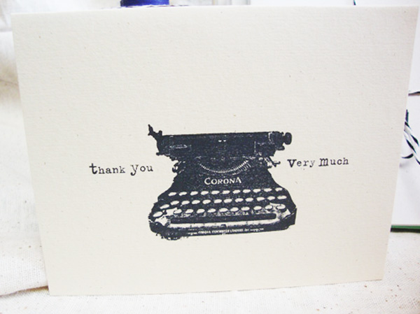 So I set about designing some notecards. I have out-of-town company here, so they couldn’t be fancy. The typewriter is the focal point, but the sentiments vary slightly: some say “thank you very much”, some “gratitude”, others “you have my undying gratitude” and finally “newsworthy”. I used an old font to fit the old typewriter stamp from Club Scrap, 2004. They are all hand-stamped and have a classic, clean look. I have a problem with just doing what I need right now – I have to do a bunch! Who knows when I’ll need extra.