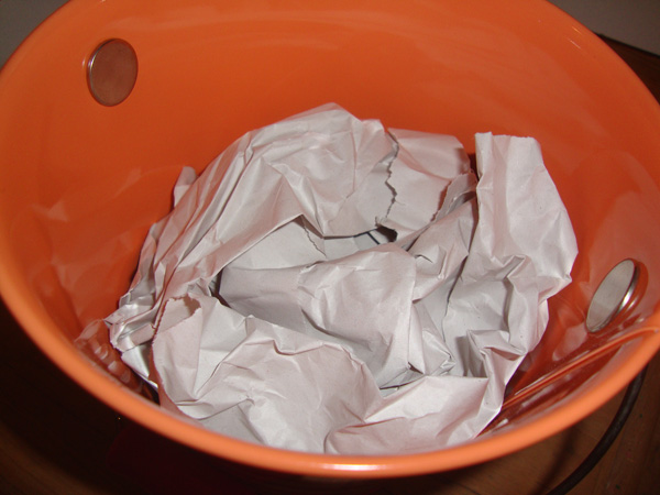 Take your empty bucket and put a wad of packing or tissue paper in the bottom. I wouldn’t use newspaper because it might make your sticks dirty from the newsprint ink. This will keep the sticks going straight down and they won’t slide around.