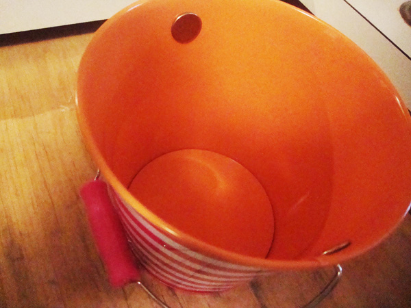 I love finding colorful containers, especially when they’re on sale! This bucket, along with a lavendar striped one, came from Bath and Body Works. It measures 4 1/2″ in diameter on the bottom and 6 1/4″ across the top. This is a bit bigger than the ones you find in the dollar bins at Target, and the broader base helps to stabilize it. Galvinized buckets can also be found, so I’m sure you can find something similar. Here’s how I do it!