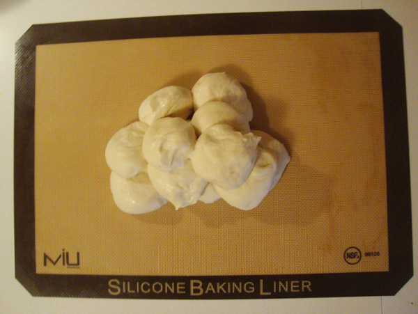 First, spray a cookie sheet or cake pan with vegetable spray. Place the frozen rolls on the pan and cover with sprayed plastic wrap. Depending on where you live and how warm your house is, this can take a few hours. Living in San Diego…in the winter…in an uninsulated house does not cause for the speedy rising of frozen bread dough, so it took mine forever to get to room temp. This is important! If the dough isn’t warmed up somewhat, it won’t knead together and roll out as successfully.
