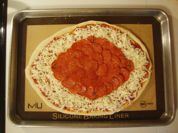 Now its time for the pepperoni. My kids don’t like me to skimp on that, so I loaded up. I didn’t take pictures of how I did it, so I’ll explain…watch the numbers!