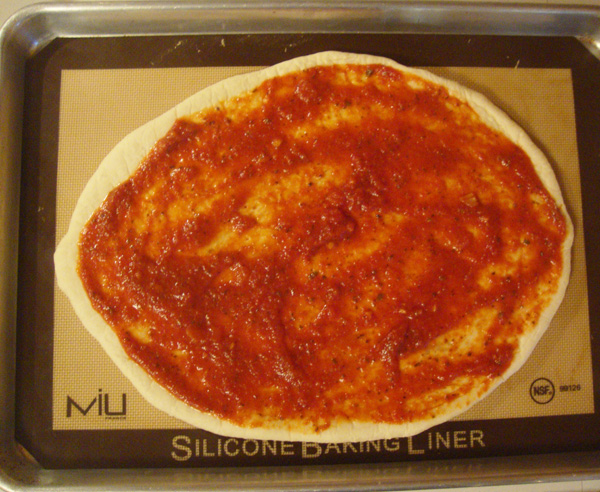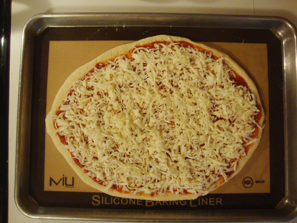 Spread the sauce on the baked crust. You can adjust it according to your family’s preferences – mine doesn’t like a ton of sauce. Next, sprinkle the grated mozzarella over the sauce.